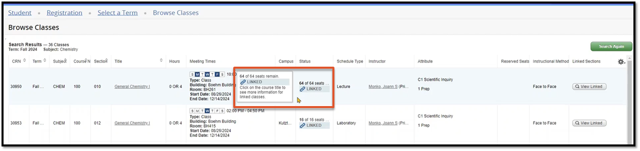 Linked classes can be found via the Class Search tool. Linked classes will be noted in the Status column.