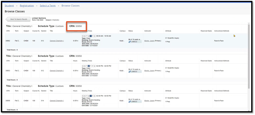 It is recommended to look for the Lecture class first and note its Course Reference Number (CRN).