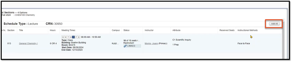 When adding lectures and labs to a schedule, it is recommended that you find the Lecture first, then click View Linked to select a lab, and then click Add All to add the lecture and lab simultaneously.